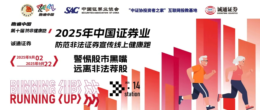 金秋九月,万象澄明。为加大防范非法证券宣传力度,更加有效保护投资者特别是中小投资者合法权益,9月2日至22日,在中国证监会、中国证券业协会、中国田径协会与“中证协投资者之家”互联网投教基地的指导下,诚通证券成功举办“跑遍中国・2025年中国证券业防范非法证券宣传线上健康跑”第十四站公益活动。