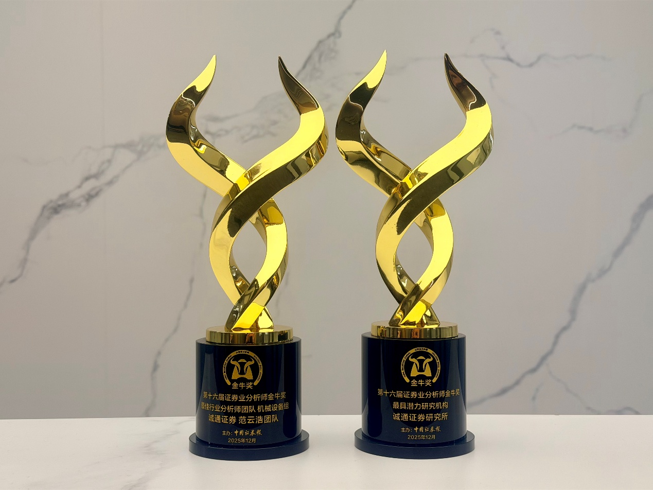 12月19日,由中国证券报主办的2025财富配置与资产管理大会在深圳召开,大会揭晓了2025年第十六届中国证券业金牛奖评选结果。诚通证券研究所荣获“最具潜力研究机构”和“机械设备组最佳行业分析师团队”两项荣誉。这是公司并入中国诚通后,研究所首次参评“金牛奖”,并同时斩获机构奖和行业单项奖。